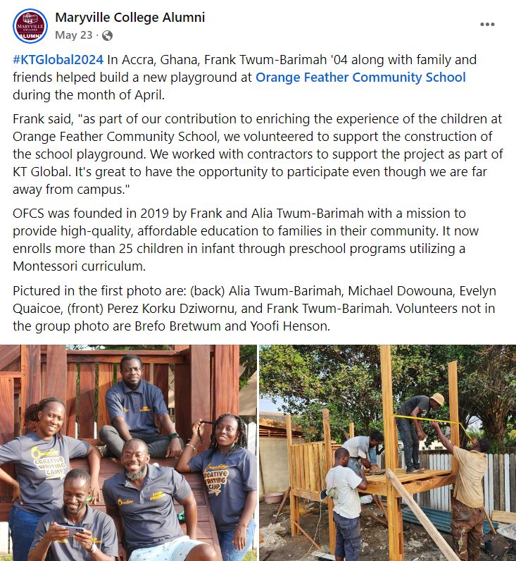 #KTGlobal2024 In Accra, Ghana, Frank Twum-Barimah ’04 along with family and friends helped build a new playground at Orange Feather Community School during the month of April.
